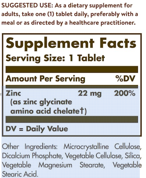 Optimal Absorption; Solgar Chelated Zinc contains a patented, chelated form of zinc to help promote optimal absorption; The 22 mg of zinc in this formulation represent 200% of the recommended daily value Immune Support; Zinc exerts antioxidant activity and can support a healthy immune system; It also supports cell growth...