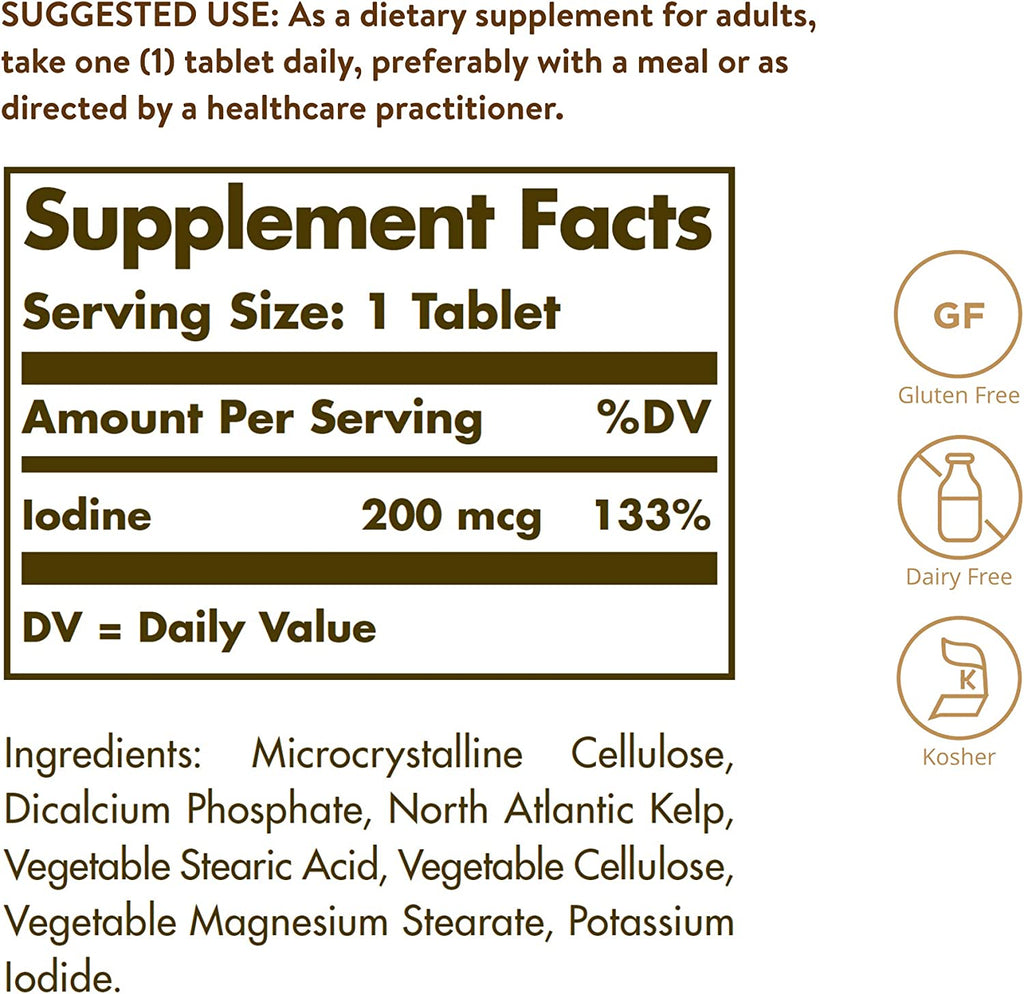 • Gluten, Wheat & Dairy Free; Solgar North Atlantic Kelp is kosher, and free of: gluten, wheat, dairy, soy, yeast, sugar, artificial flavor, sweetener, preservatives, and color; Suitable for vegetarians